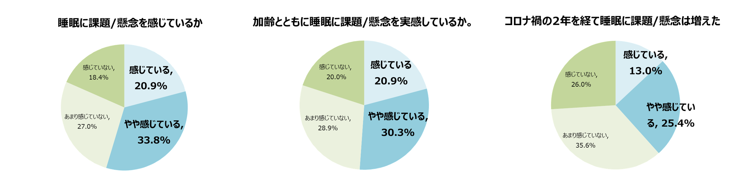 現在睡眠に課題や懸念を感じている人は、「感じている」「やや感じている」を合わせて54%と全体の半数を超えました。さらに、5割以上の人が「加齢とともに課題として感じている/やや感じている」と回答。さらに、コロナの2年間で懸念が増えた人は4割弱でした。