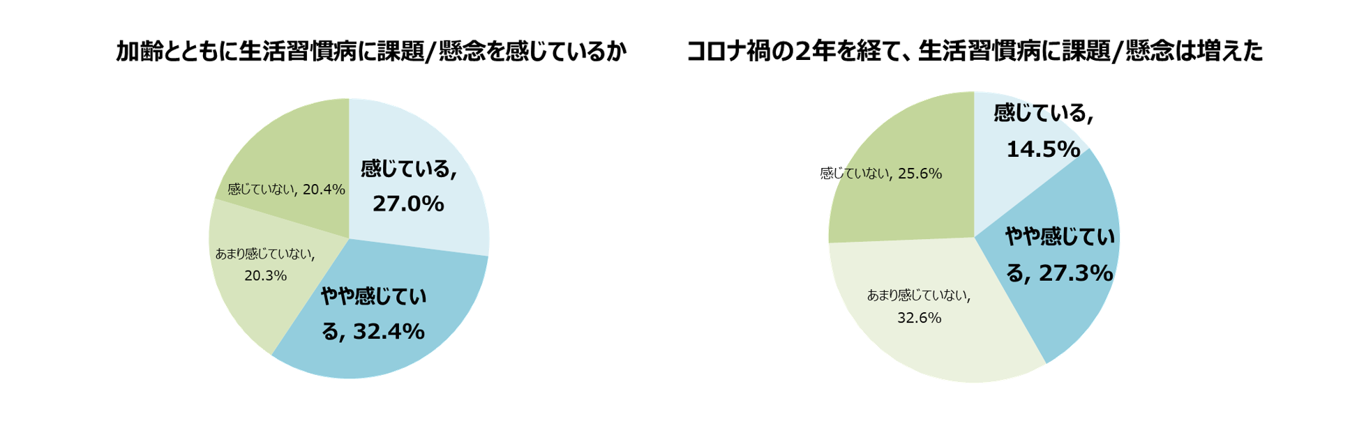 ミドルシニアでは、6割近くの人が加齢とともに生活習慣病(糖尿病、高血圧症、脂質異常症)への懸念を感じており、4割以上の人がコロナ禍の2年間でその懸念が増えたと回答。多くの人が睡眠問題と生活習慣病に悩まされていることがわかりました。