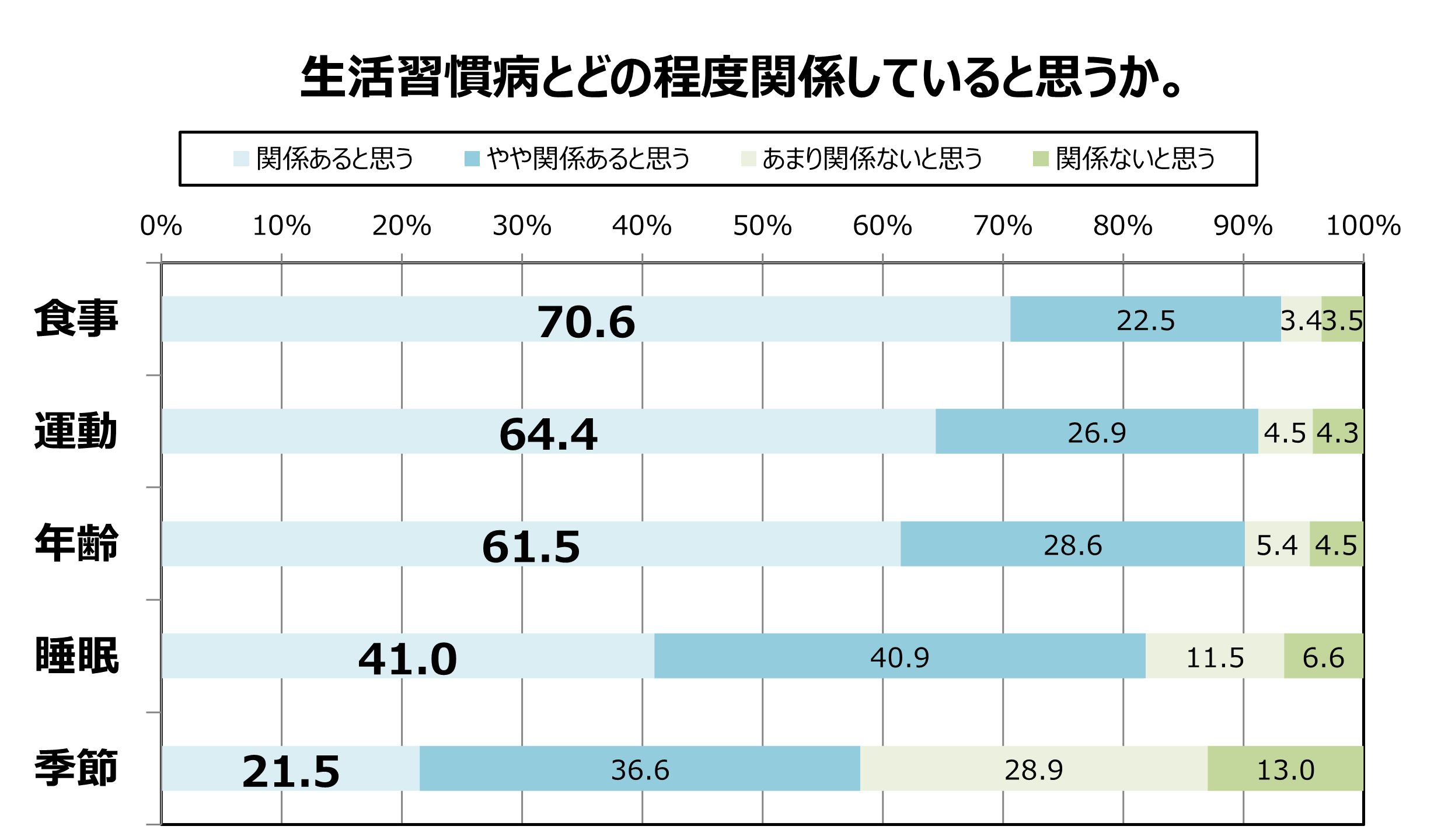 生活習慣病の原因について聞いたところ、食事、運動、年齢が「関係あると思う」と回答した人はそれぞれ70%、64%、61%なのに対して、生活習慣病の原因として睡眠が「関係あると思う」と回答した人は41%、季節が「関係あると思う」と回答した人は21%に留まっています。実は睡眠問題は「生活習慣病の入り口」と言っても過言ではないほど深く関わっています。質の悪い睡眠は生活習慣病の罹患リスクを高め、かつ症状を悪化させるとされています* 。また秋冬は運動量・日に当たる量が減るため、コロナ禍による運動量低下と相まって睡眠ホルモンの分泌が減少するとされています。