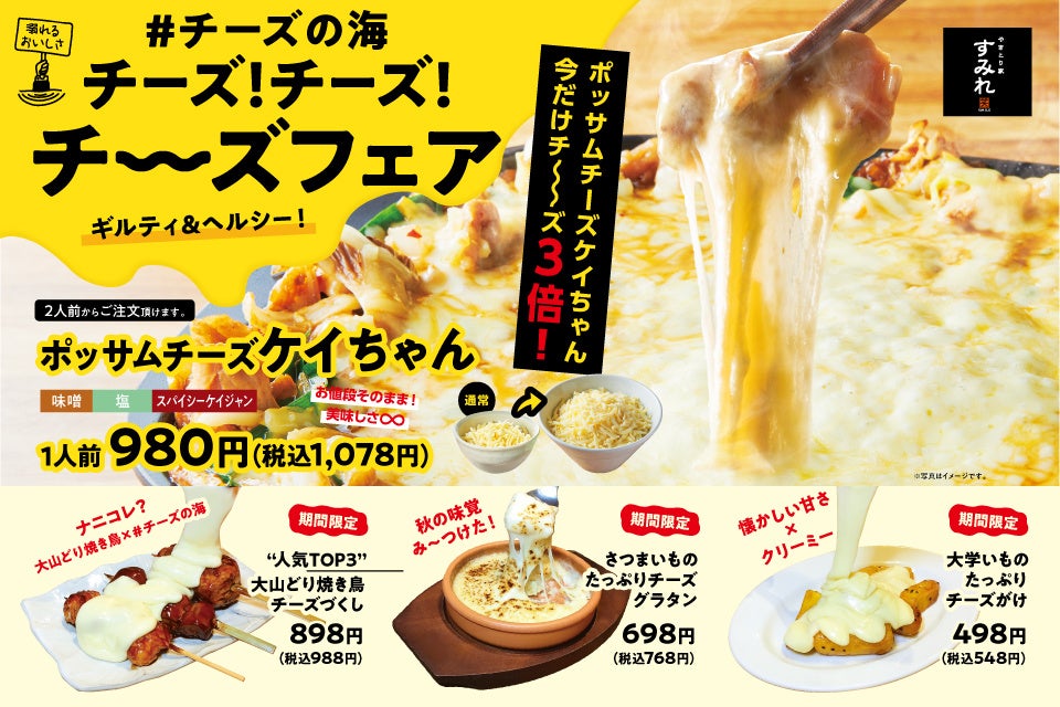 大山どり焼き鳥専門店の「やきとり家すみれ」を展開する株式会社すみれ(所在地:東京都渋谷区/代表取締役:湯澤忠則)は、コロナ3年目で健康嗜好が高まる中、ご褒美デーとして外食では思いっきり楽しみたいと思っている方に向けて、大山どりと秋の味覚のさつまいもをチーズで思いっきり楽しむ「チーズ!チーズ!チーズフェア」を2022年10月1日(土)~10月31日(月)で全店にて開催いたします。