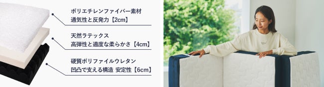 ラテックスの上部にポリエチレンファイバーを入れることで通気性と放熱性を確保し、下部の硬質ウレタンは凹凸でラテックスを支え、より良い体圧分散を実現しました。