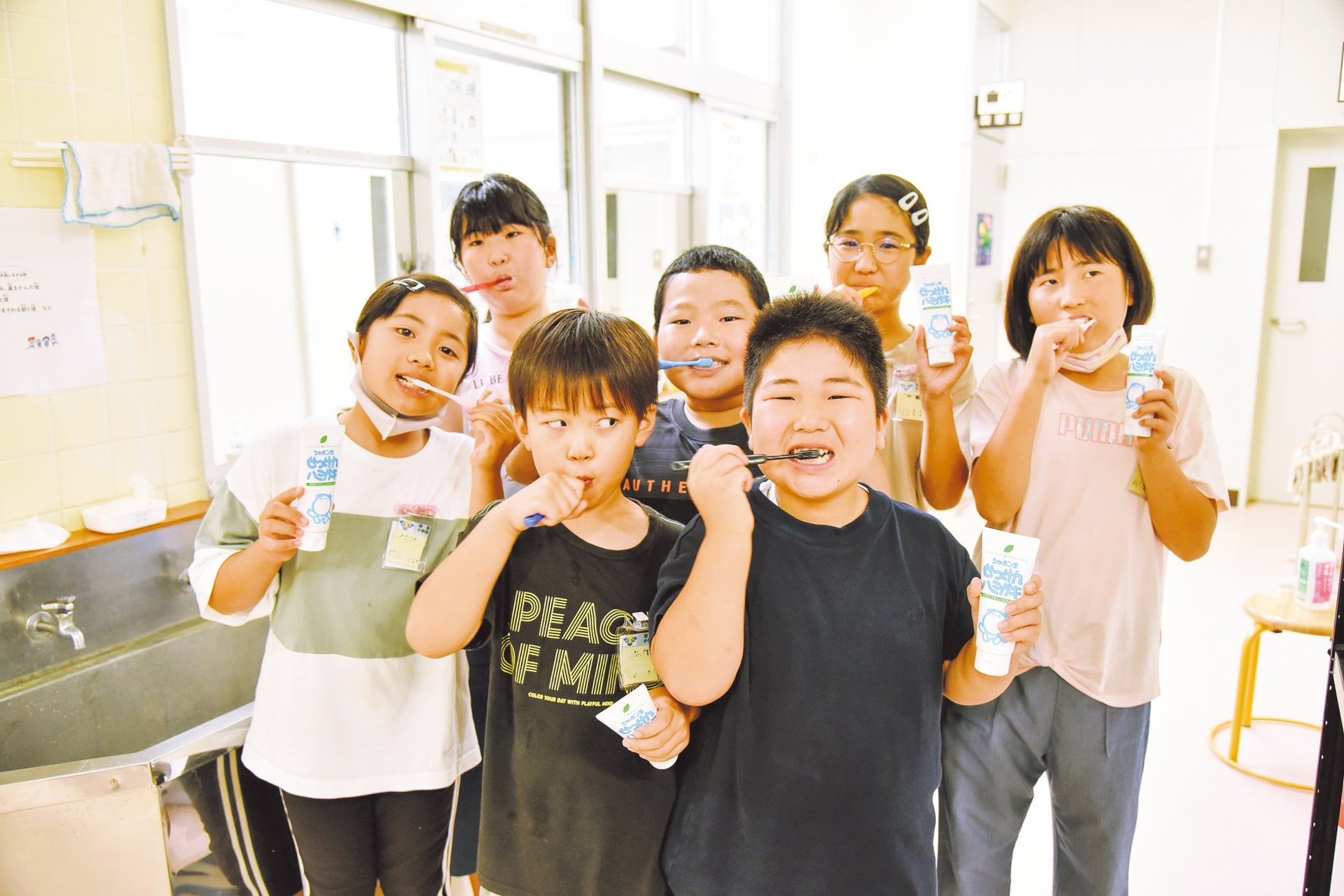 ▲無添加石けんハミガキを使う地島小学校の子供たちの様子