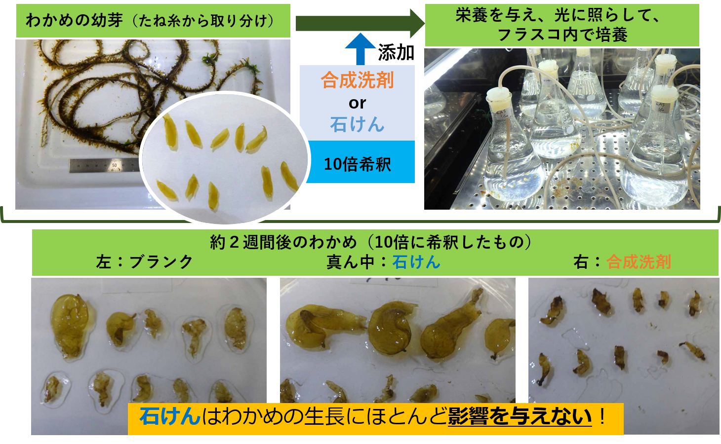 10倍希釈した合成洗剤、また石けんを添加したわかめの約2週間の生育の状況を観察したところ、2週間後、石けんを添加したわかめは何も添加していないブランクの状態とほとんど変わらない程度に生長しているのに対して、合成洗剤を添加したものはわかめの生長に影響を与えていることが分かりました。また、実際の環境下ではありえない条件ではありますが、同じようにわかめの幼芽に合成洗剤の原液をそのまま添加すると1日で白化してしまうようなことも分かりました。このように、石けんはわかめの生長にほとんど影響を与えないことも分かりました。
