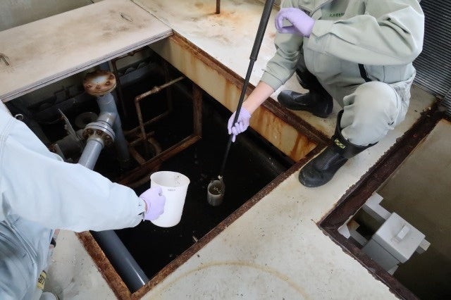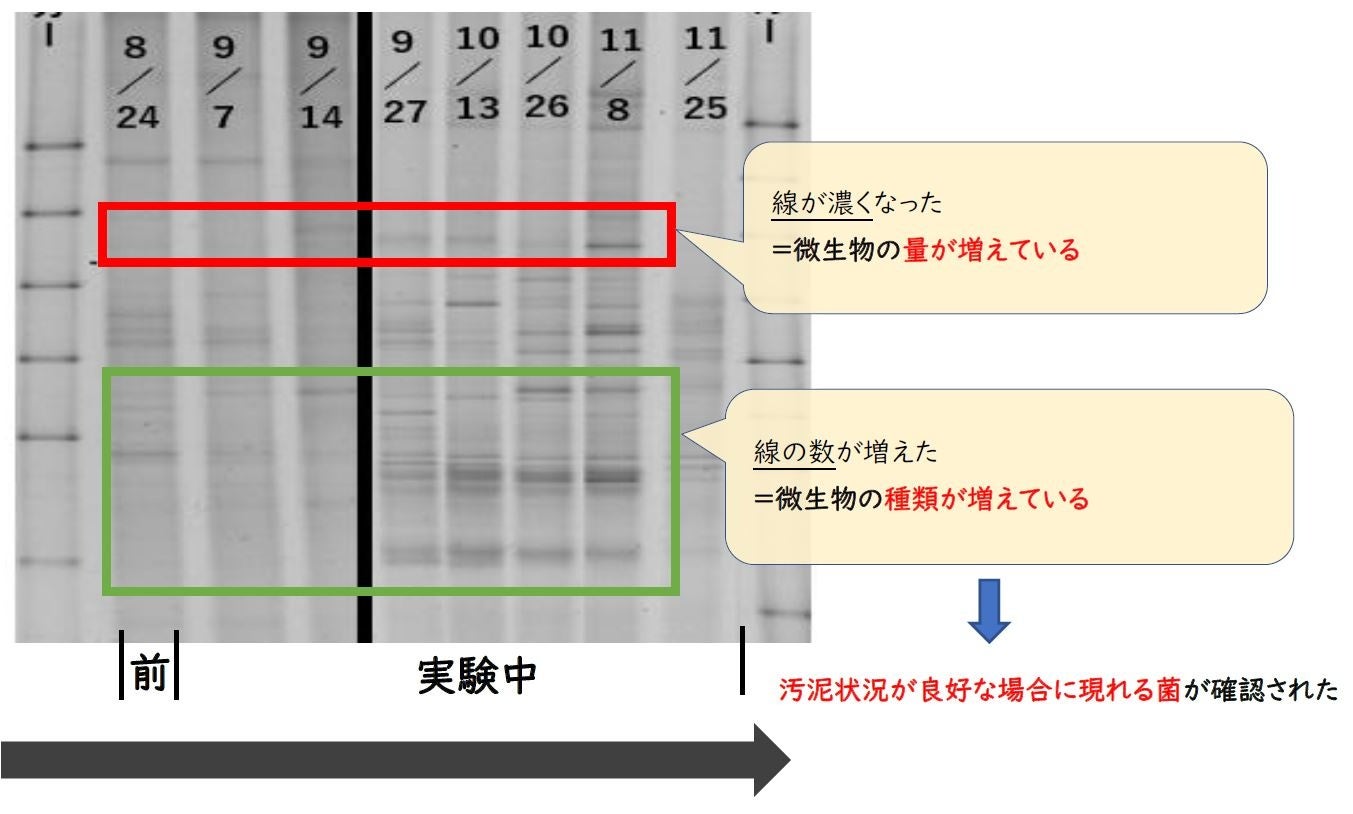 下水処理場の曝気槽(水をきれいにする施設)にいる微生物を分析した結果、微生物の種類・量が増えていることが分かりました。また、汚泥状況が良好な場合に現れる菌が確認され、曝気槽の環境に良い影響を与えたと考えられます。