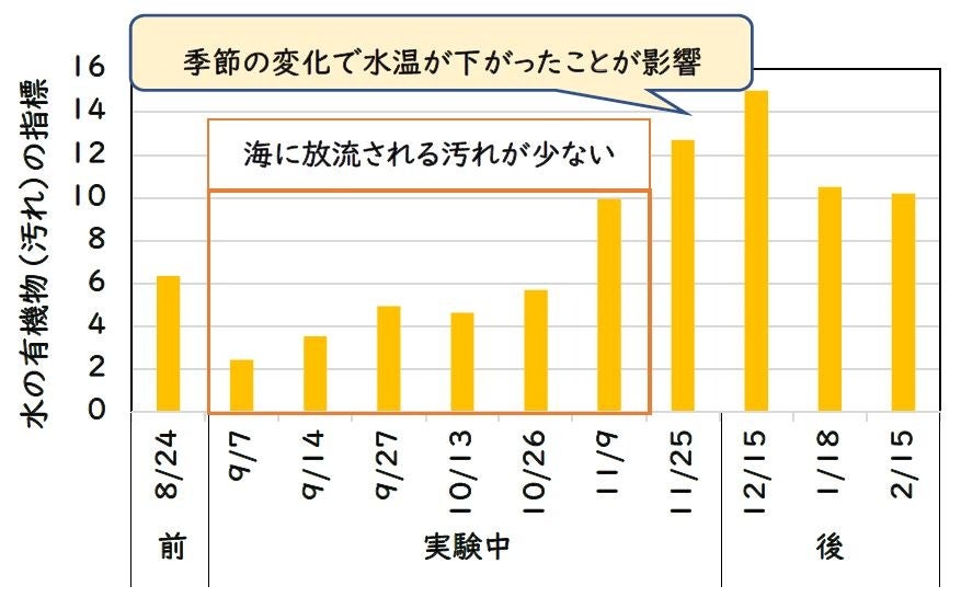 その結果、石けんの使用に切り替えたことで、下水処理場内の微生物が豊かになることや水中の有機物(汚れ)を低減させること、生態系に影響を与える可能性がある物質の排出量が減ることなどが分かりました。また、住民アンケートの調査結果から、実験を通して環境問題に関心がある人が増えたことも分かりました。