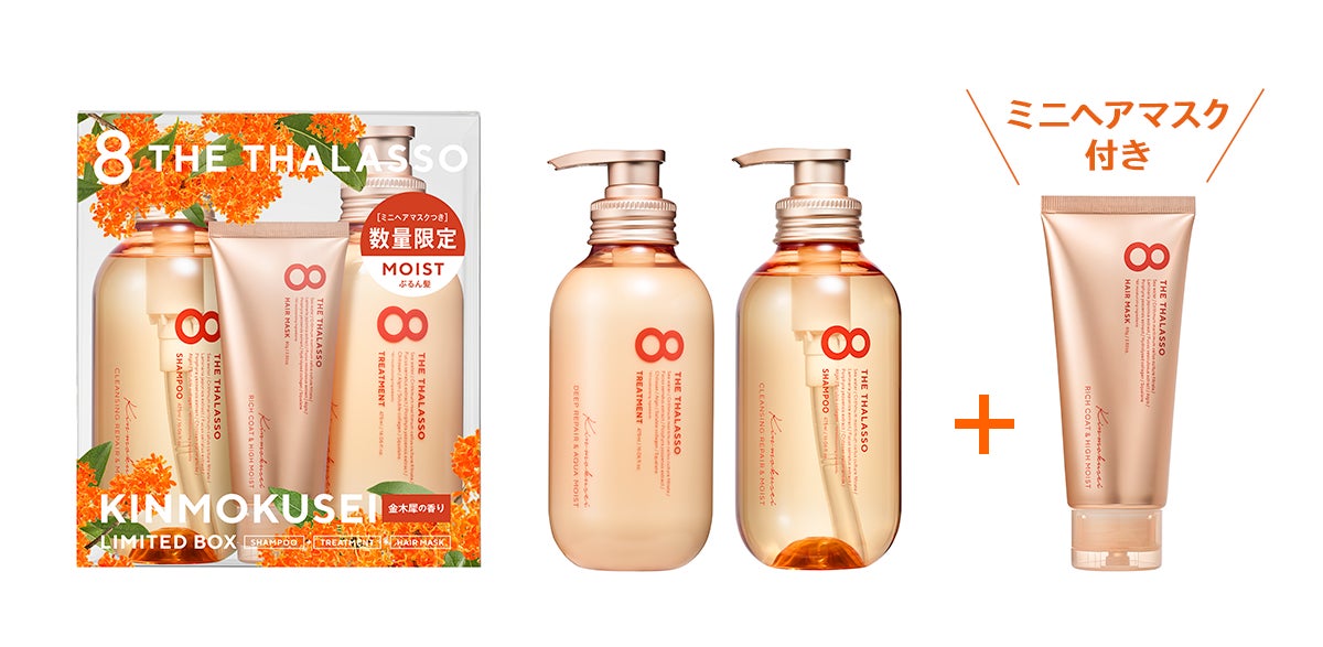シャンプー&トリートメントに高濃度*2美容液配合のヘアマスクがミニサイズで付いた限定キットの他、いつものケアにプラスワンできるヘアミストとヘアミルクが登場。「エイトザタラソ」の仕上がりはそのままに、甘くやわらかな「金木犀の香り」と限定のデザインで、秋の気分を盛り上げます。インバスからアウトバスケアアイテムまで、充実のラインアップで髪のトータルケアをサポートし、美髪へと導きます。