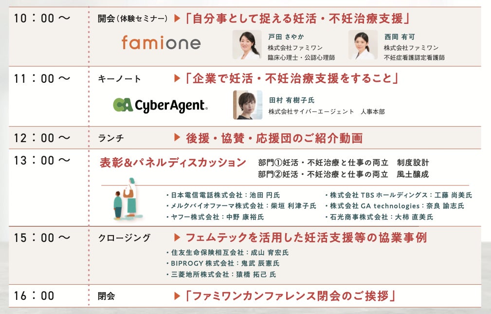 ファミワンとして初のカンファレンスとなる今年は、「不妊治療と仕事の両立支援、何から始める?」をテーマに、基調講演などを行います。キーノートには卵子凍結支援の発表もあったサイバーエージェントの田村さまをお呼びし、企業で妊活・不妊治療の支援を行うことについて講演いただきます。