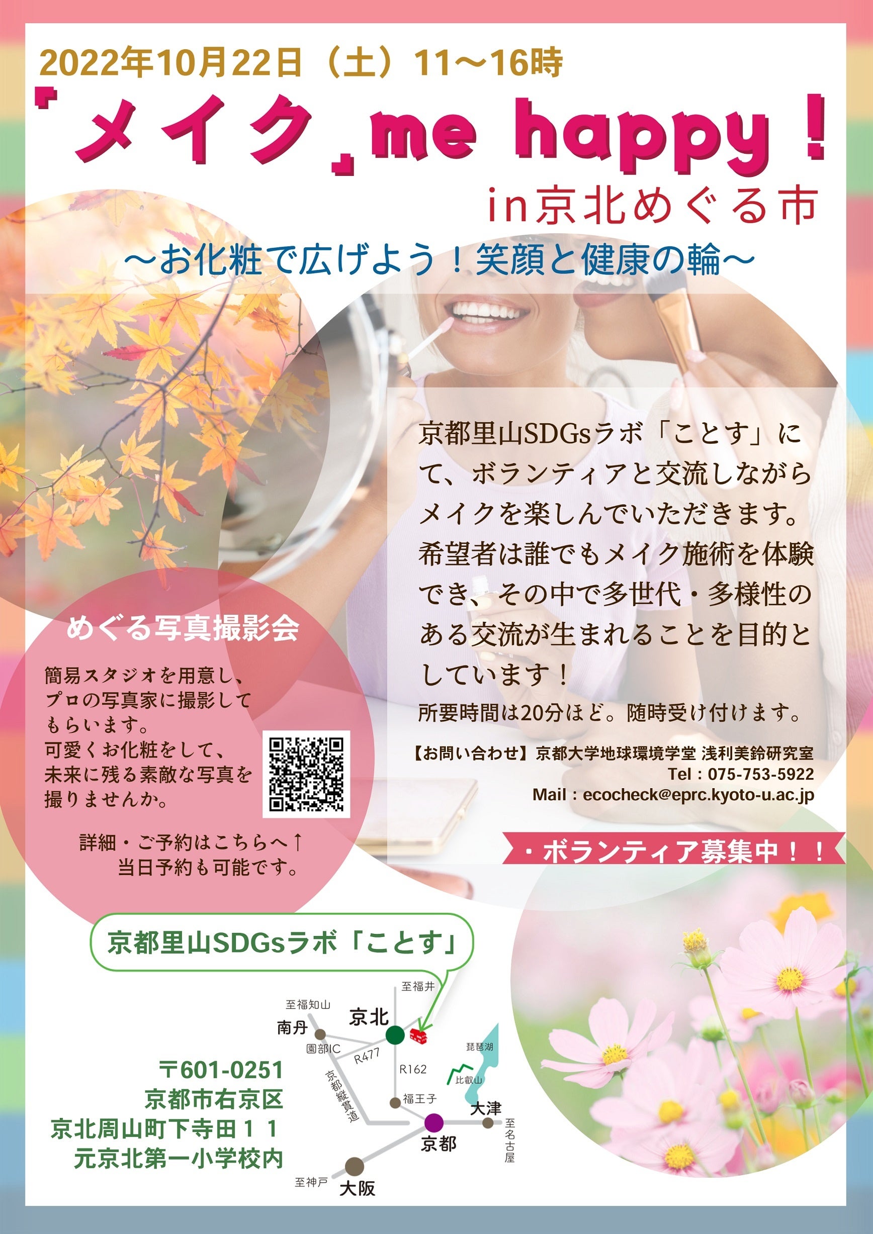 10月の「京北めぐる市」テーマは、「メイク」me happy! ~お化粧で広げよう 笑顔と健康の輪~。広くボランティアを募り、多世代・多様性のある交流が生まれることを目的とし