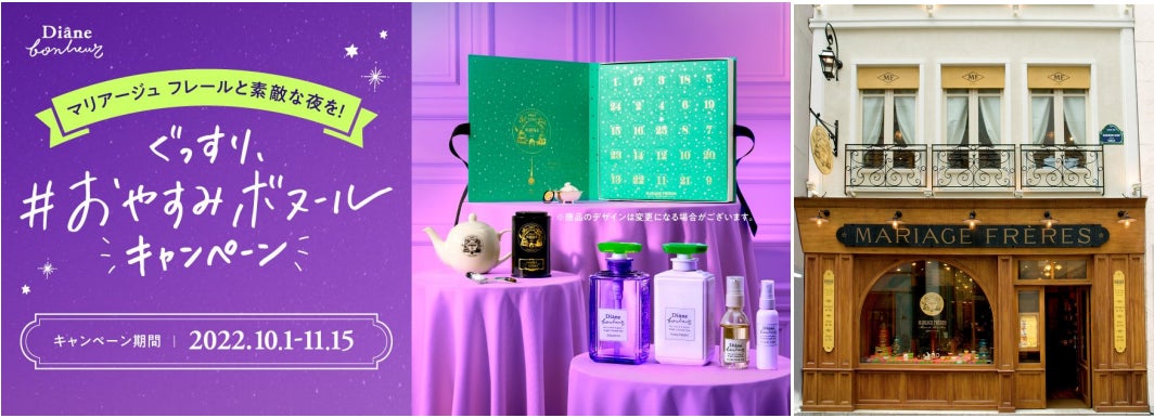 株式会社ネイチャーラボ(本社:東京都渋谷区)が展開する、ヘアケアブランド『ダイアンボヌール』「ナイトドリームティーの香り」の発売を記念して、パリ創業のフランス老舗紅茶ブランド『マリアージュ フレール』のグッズが当たる「ぐっすり、#おやすみボヌール キャンペーン」を実施いたします。