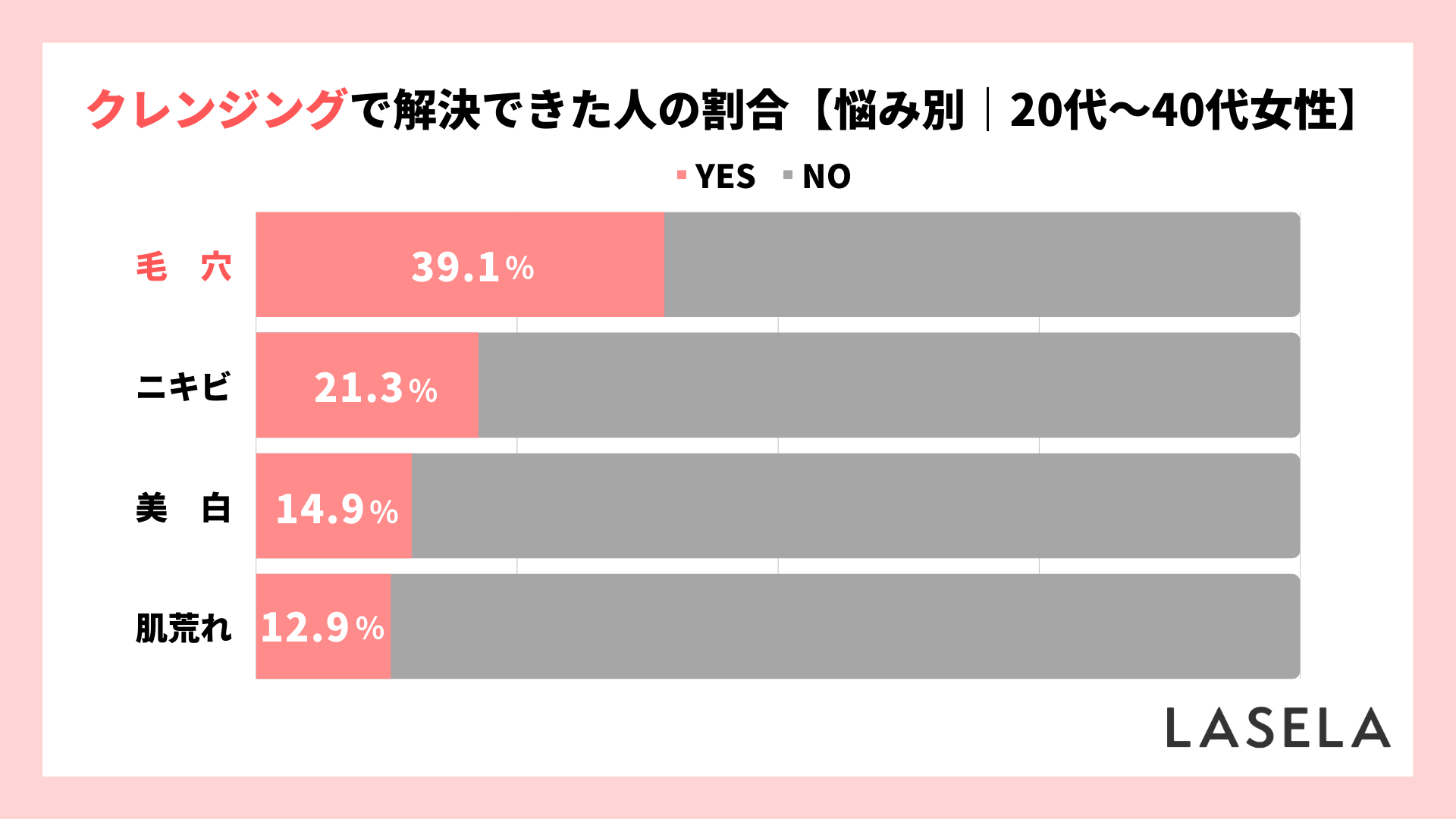 この結果を悩み別に見てみると、クレンジングで症状を改善した割合が最も高かったのは「毛穴」で39.1%でした。