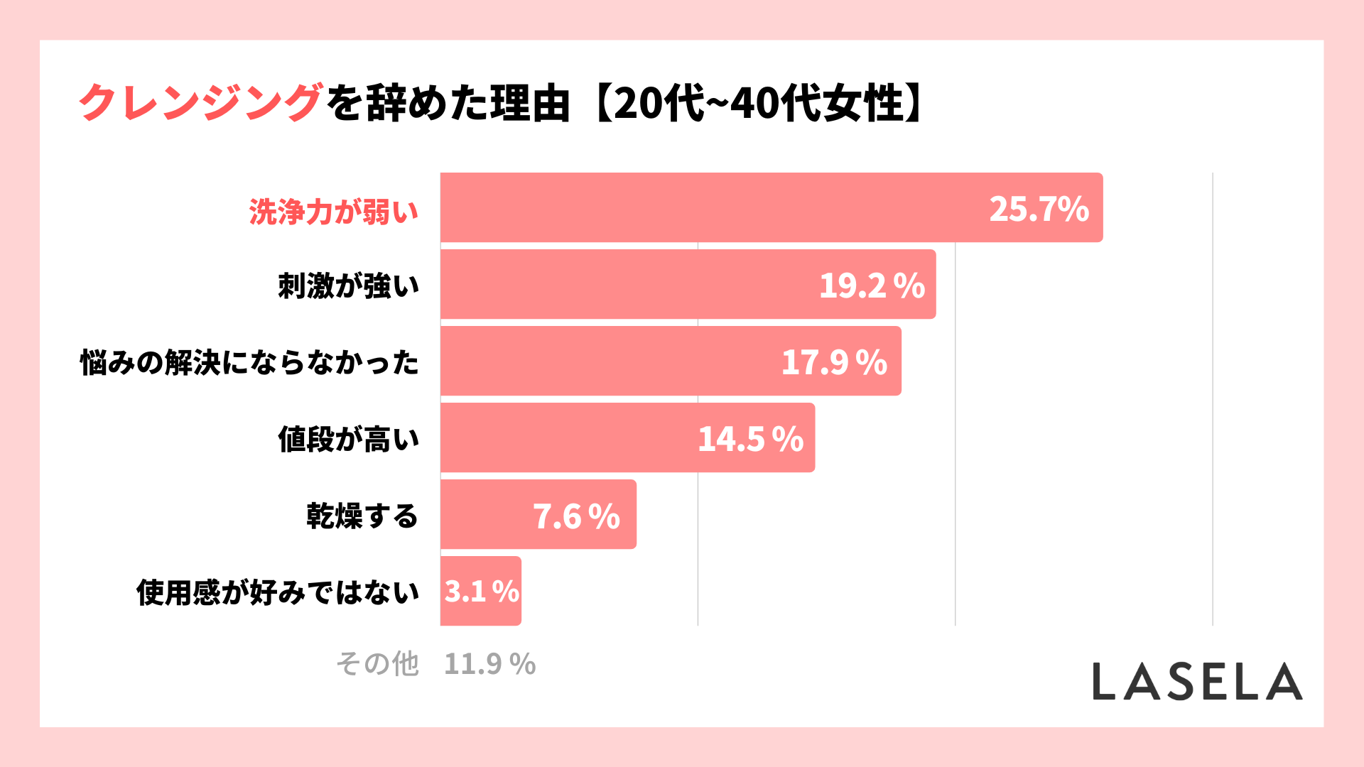 • クレンジングを辞めた理由TOP3は「洗浄力が弱い」「刺激が強い」「悩みの解決にならなかった」