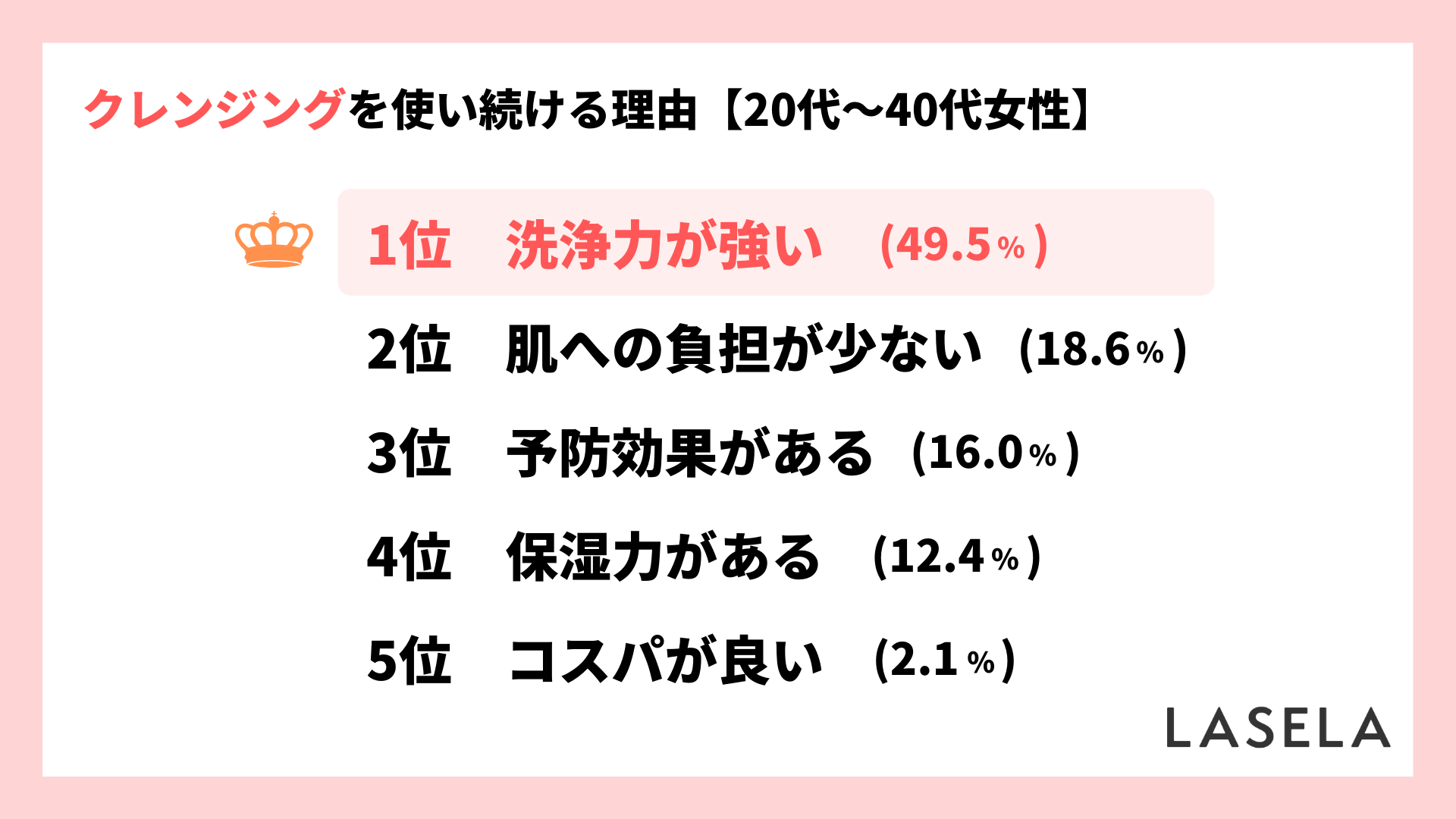 • クレンジングを使い続ける理由、「洗浄力が強い」が約半数で最多