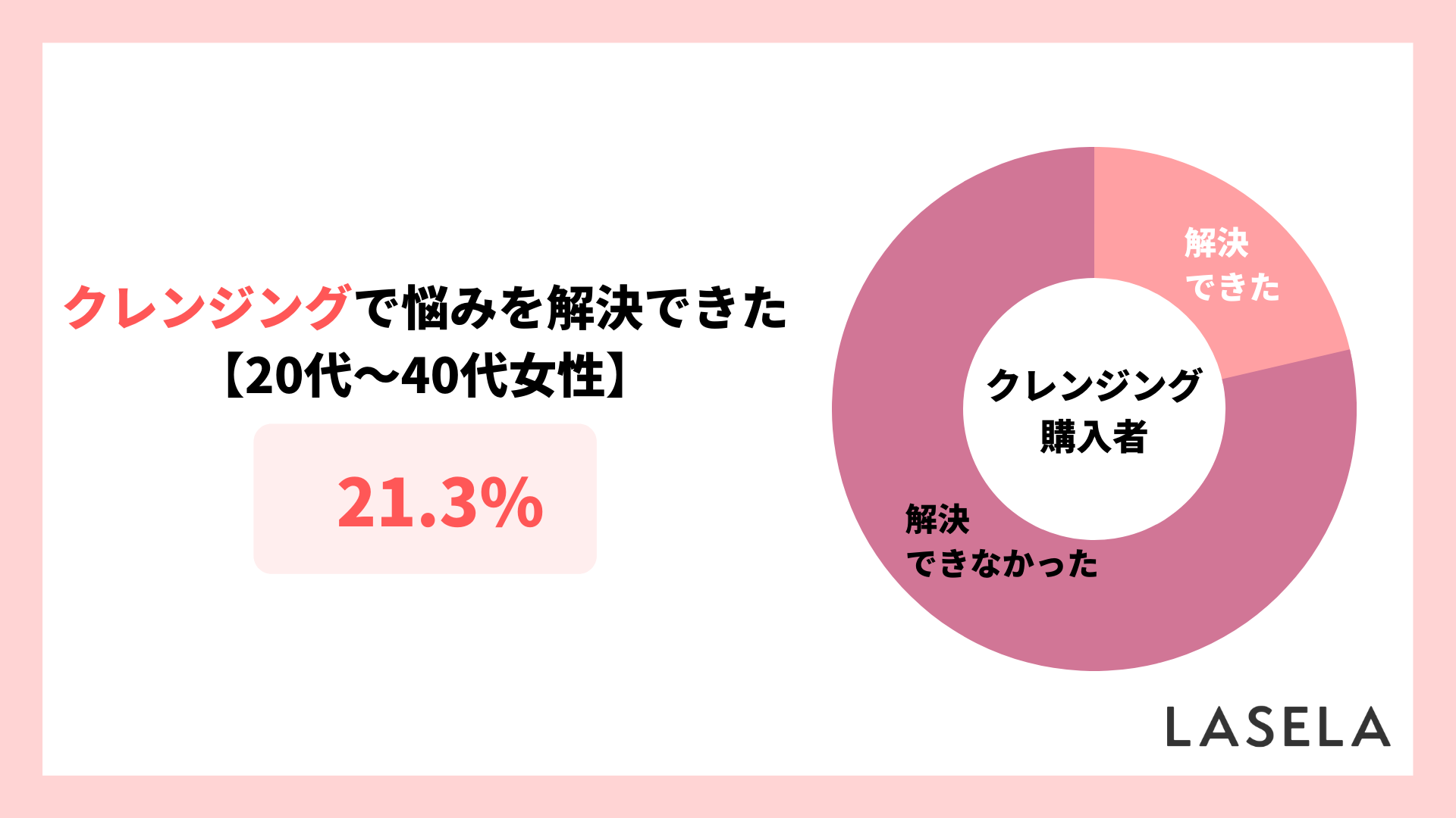クレンジングを購入した909人に、悩みを解決できたかをたずねたところ、「できた」が21.3%、「できなかった」が78.7%でした。クレンジングを購入した約8割が、肌トラブルを解決できなかったようです。