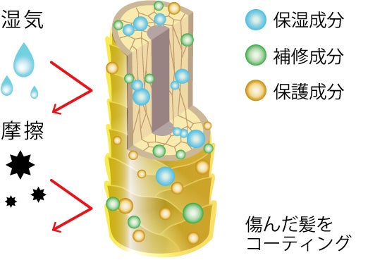様々なダメージを受けて空洞化してしまった髪の内側を保湿・補修成分で満たし、コーティング成分で傷んだ髪表面を保護します。