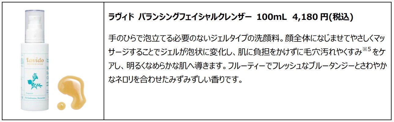 「ラヴィド バランシングフェイシャルクレンザー」は、なめらかなテクスチャーのジェルが肌の上で泡に変化し、泡立て不 要で肌に負担をかけない時短洗顔を叶える洗顔料です。天然ココナッツ泡※1 が古い角質による毛穴汚れやくす みをケアし、明るくなめらかな肌へ導きます。またキープラントとして、お肌を清潔に保ち、うるおいを与える、ザクロ※2 やプロポリス※3、ビターオレンジ※4(ネロリ) を配合しています。 忙しい方や手早く済ませたい方にも、泡立てる必要がないので手間なくお使いいただけます。時短を叶えながらも、適度な洗浄力ですっきり感がありつつ、うるおいも感じられる洗いあがりです。