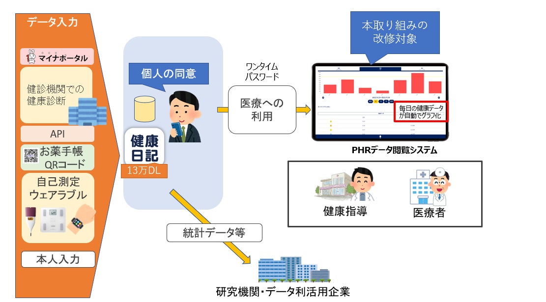 医療者が『健康日記』内に保存された健診結果と日々の健康データを、総合的、かつ日常診療でも利用可能なサマリーとして表示・閲覧できるサービスを構築し、実装への取組を進めます。