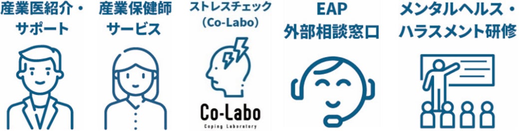 産業医紹介・選任後の業務サポートをはじめ、ストレスチェック『Co-Labo』、産業保健師サービス、EAP外部相談窓口、メンタルヘルス・ハラスメント研修、専門家相談サービス等で、企業の健康経営を総合的に支援しています。