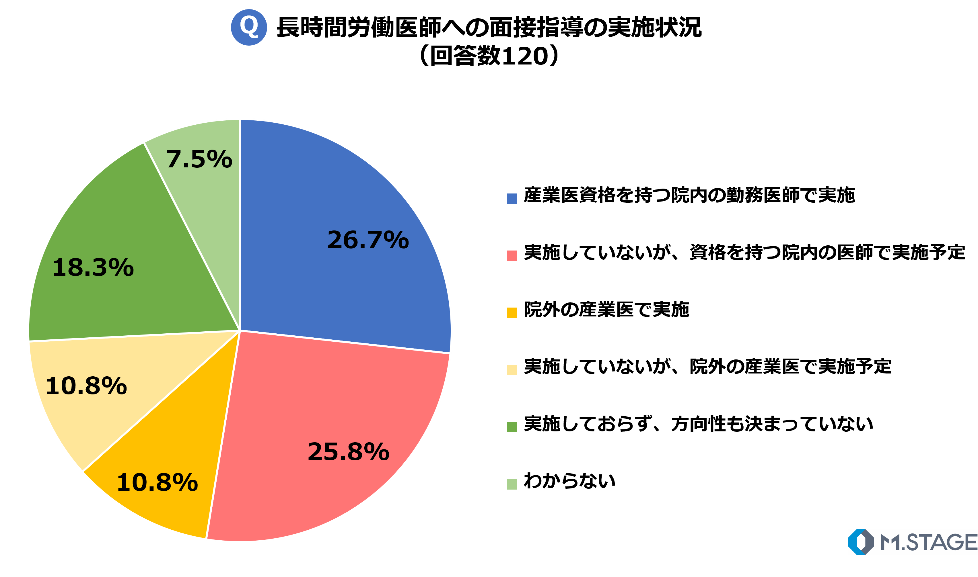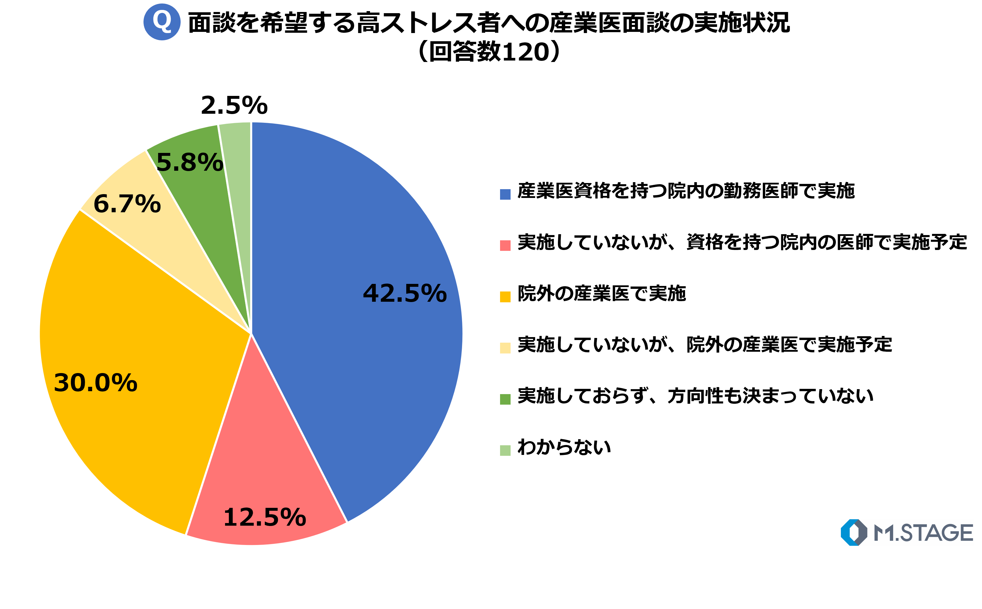 産業医資格を持つ院内の勤務医師で実施・実施予定の医療機関が半数以上となりましたが、院内医師の場合は、職場の同僚という立場でもあるため、お互いに指導がしにくい・相談が気まずい、といった理由で積極的な活動につながりにくい課題があります。