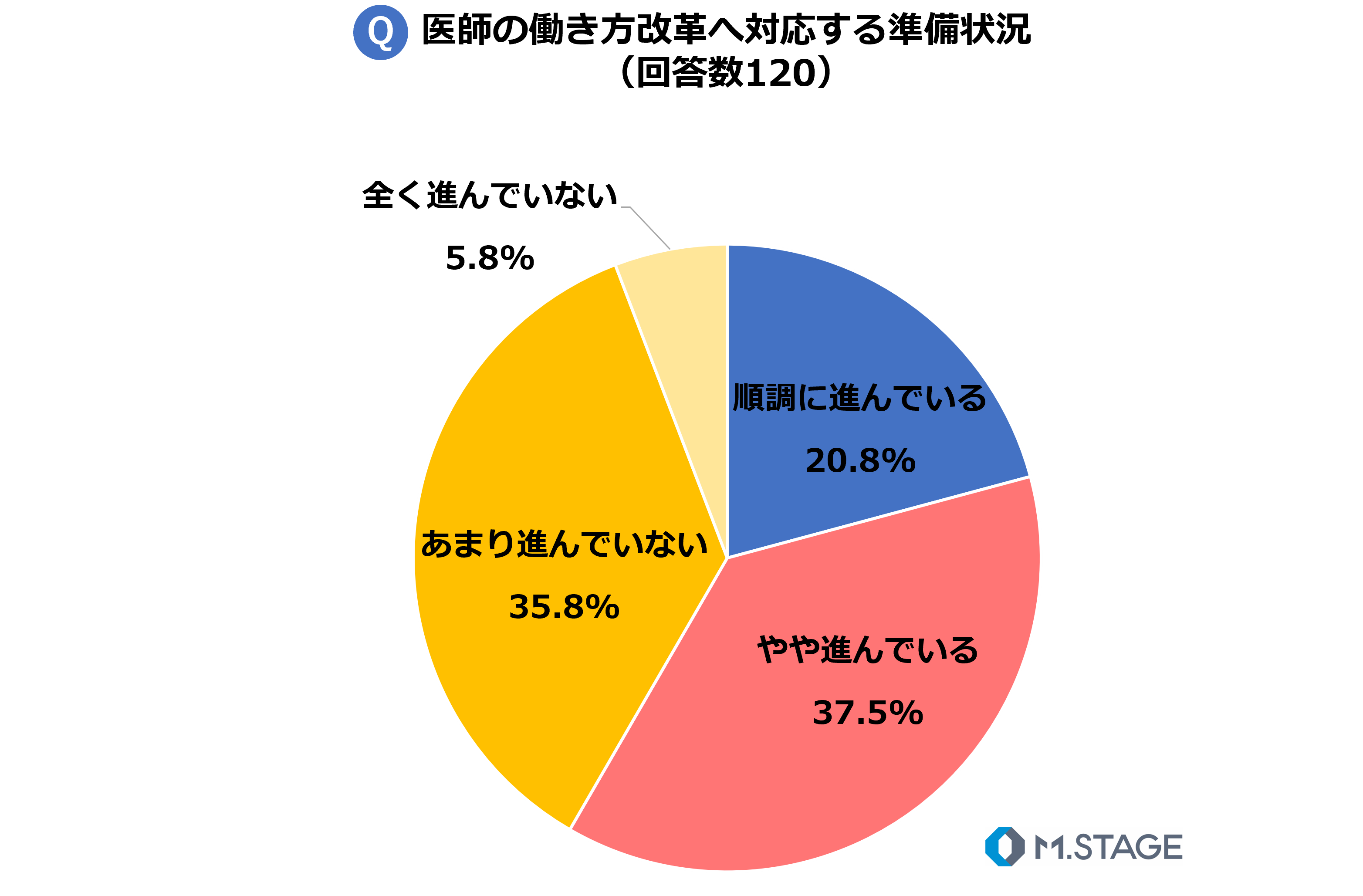 医師の働き方改革への準備状況について質問したところ、「順調に進んでいる」20.8%、「やや進んでいる」37.5%、「あまり進んでいない」35.8%、「全く進んでいない」5.8%となりました。約6割の医療機関において取り組みが進んでいますが、順調と回答した医療機関は約2割となりました。