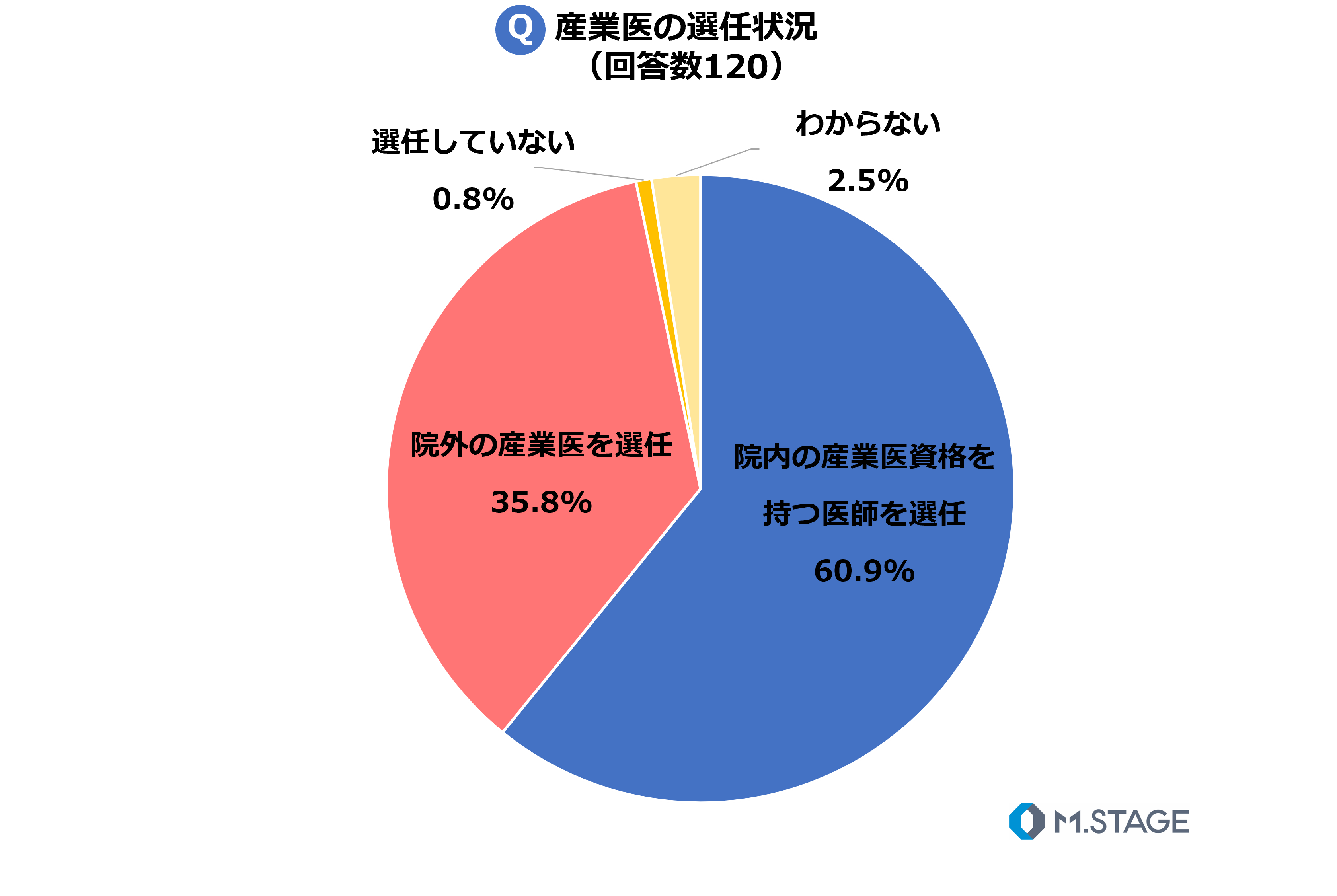 - 6割の医療機関が「院内の勤務医師」を産業医として選任。今後は院外産業医の活用の広がりも