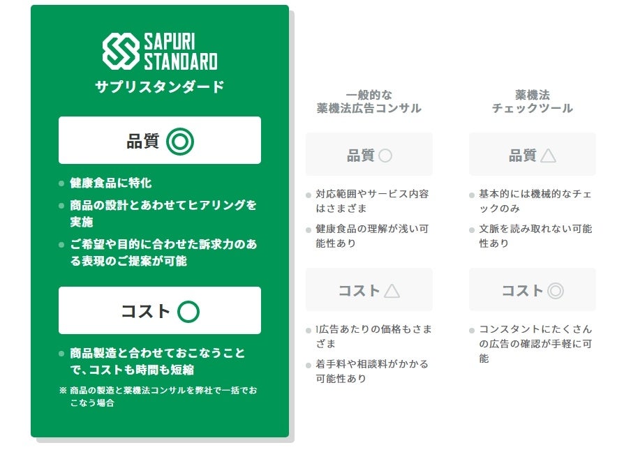 株式会社サプリスタンダード(本社:茨城県、代表取締役:田中 悠貴)は、新たに「健康食品の薬機法広告コンサル」のサービスを開始しました。
