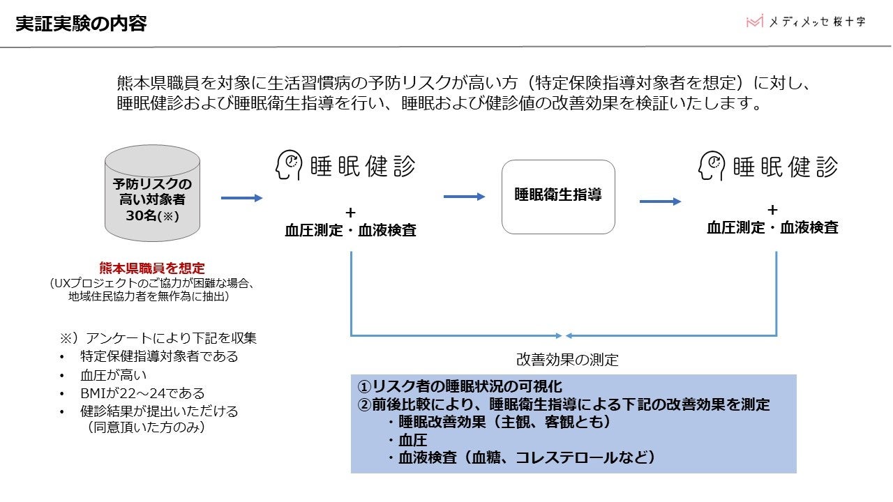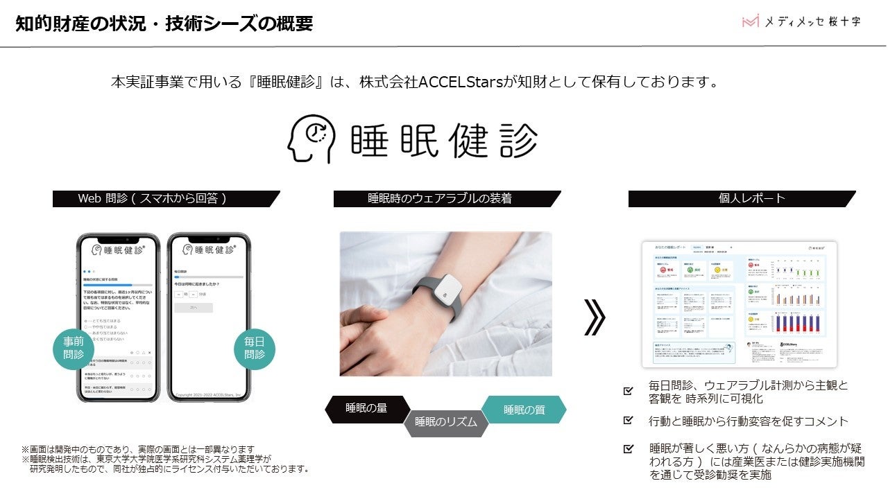 熊本県(知事:蒲島郁夫)が募集した令和4年度UXプロジェクト実証実験サポート事業(以下、「UXプロジェクト」)に、医療法人桜十字(本社:熊本県熊本市、理事長:倉津純一、以下「桜十字」)と東京大学医学部発のMedical Sleep Techスタートアップである株式会社ACCELStars(アクセルスターズ)(本社:福岡県久留米市、代表取締役社長:宮原禎、以下、「ACCELStars」)が共同で採択されましたことをお知らせいたします。睡眠データによる健康・医療・介護に寄与する影響を明らかにしていくことを目指し、本日、採択に至りましたのでご報告申し上げます。