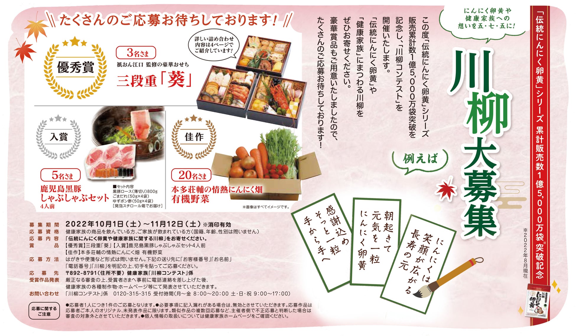 健康家族では、<伝統にんにく卵黄>シリーズ販売累計数1億5,000万袋突破を記念して、「川柳コンテスト」を開催する。「伝統にんにく卵黄」や「健康家族」にまつわる川柳を募集。優秀賞に選ばれると「おせち三段重(祇おん江口 監修)」、入賞で「鹿児島黒豚しゃぶしゃぶセット(4人前)」、佳作で「本多荘輔の情熱にんにく畑で穫れた有機野菜」と、豪華賞品を用意している。
