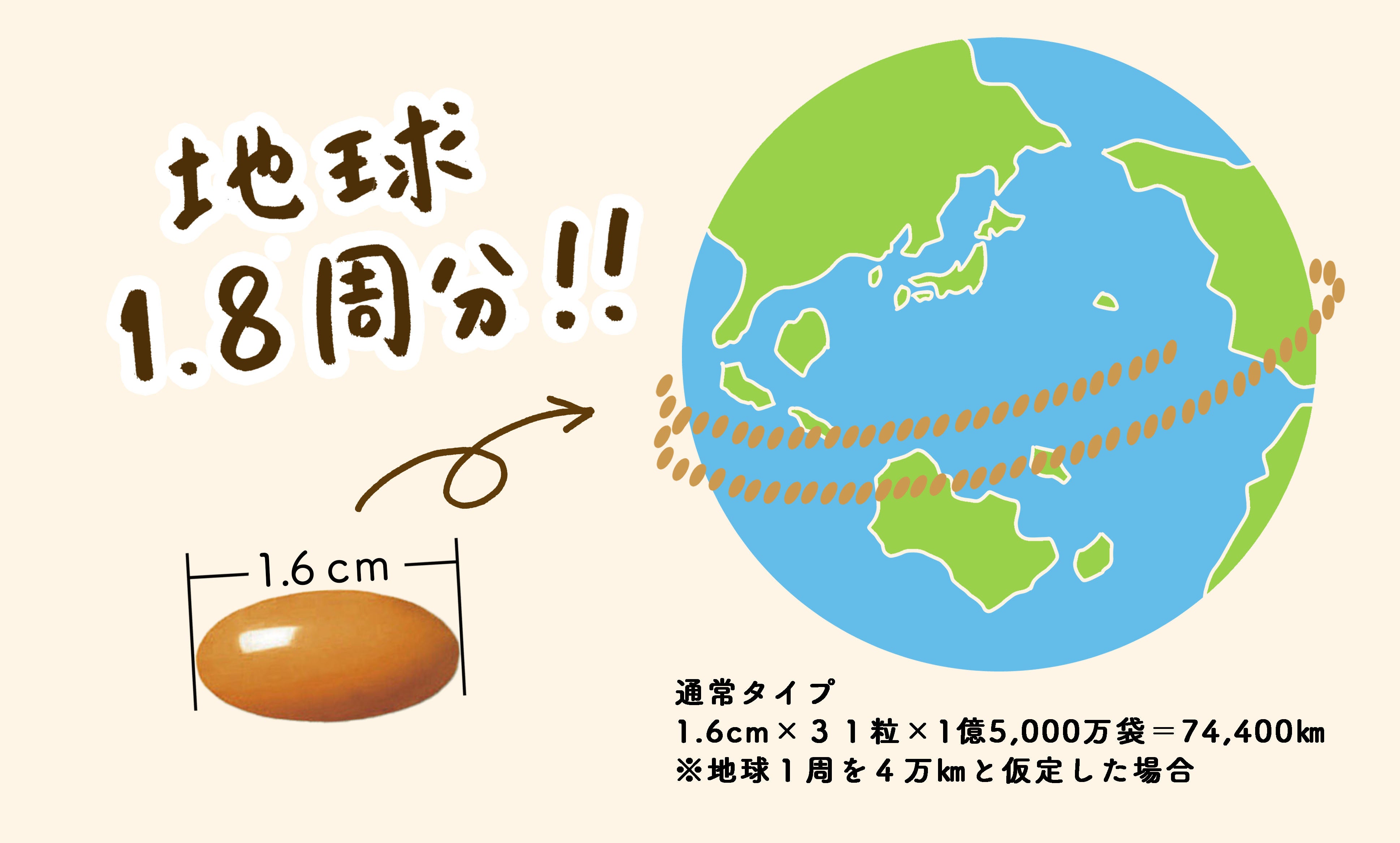 そんな取り組みにファンは年々増え続け、2012年にはシリーズ販売累計数が1億袋を突破。そして2022年8月に1億5,000万袋を突破した。仮にその粒を並べたとすると、合計総距離はなんと74,400km。地球1.8周分にも及ぶ。(※通常タイプ1.6cmで換算)