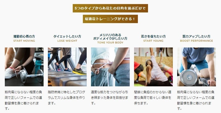 ・5つのプログラムから自分に合ったプログラムを選ぶだけで、AIがマシンの負荷や回数を全て自動調整。理想の身体を目指して筋力をつけたい若年層の方から健康維持を考える年配の方まで効率よくトレーニングをしていただけます。