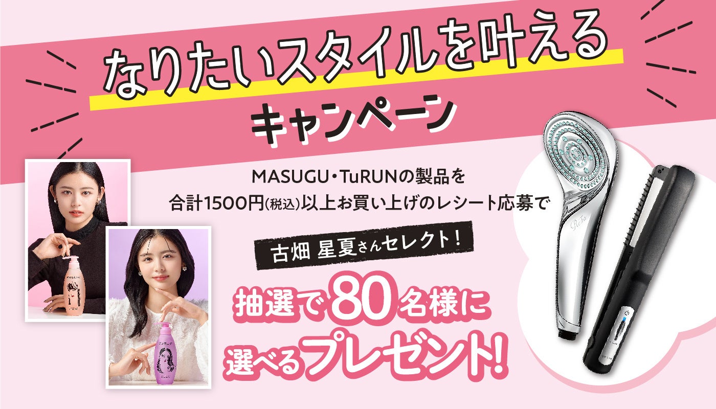 10月3日(月)より、MASUGU・TuRUNの製品を合計1,500円(税込)以上お買い上げの方に、レシートのWEB応募で当たる「なりたいスタイルを叶える」キャンペーン。古畑星夏さんイチオシのなりたいスタイルを叶える美容家電が当たります。またヘアマスクorヘアオイルを購入して応募すると当選確率2倍。