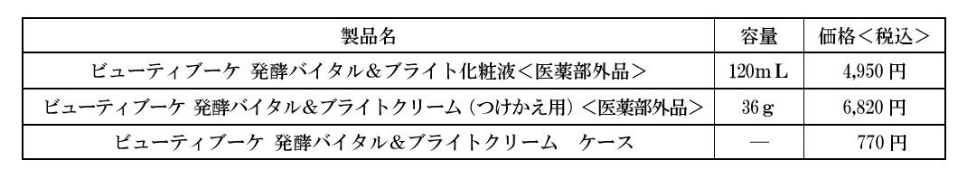 <製品一覧> ※ビューティブーケ 発酵バイタル&ブライトクリームは、つけかえ用とケースは別売りです。