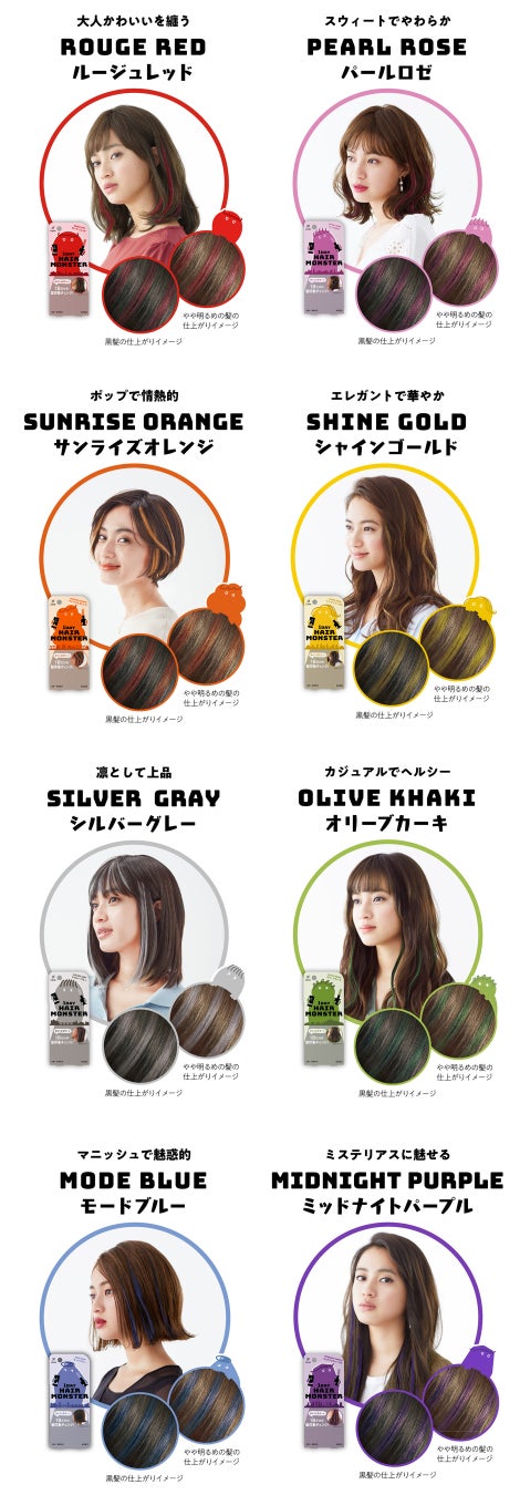 新しくなった「リーゼ 1DAYヘアモンスター」は、発色性能がさらに向上し、ひと塗りでしっかりと色づくようになり、より手軽にポイントカラーをお楽しみいただけるようになりました。また、新色は、ポップで情熱的な印象に仕上がる“サンライズオレンジ”と、上品で凛とした印象に仕上がる“シルバーグレー”の2色です。