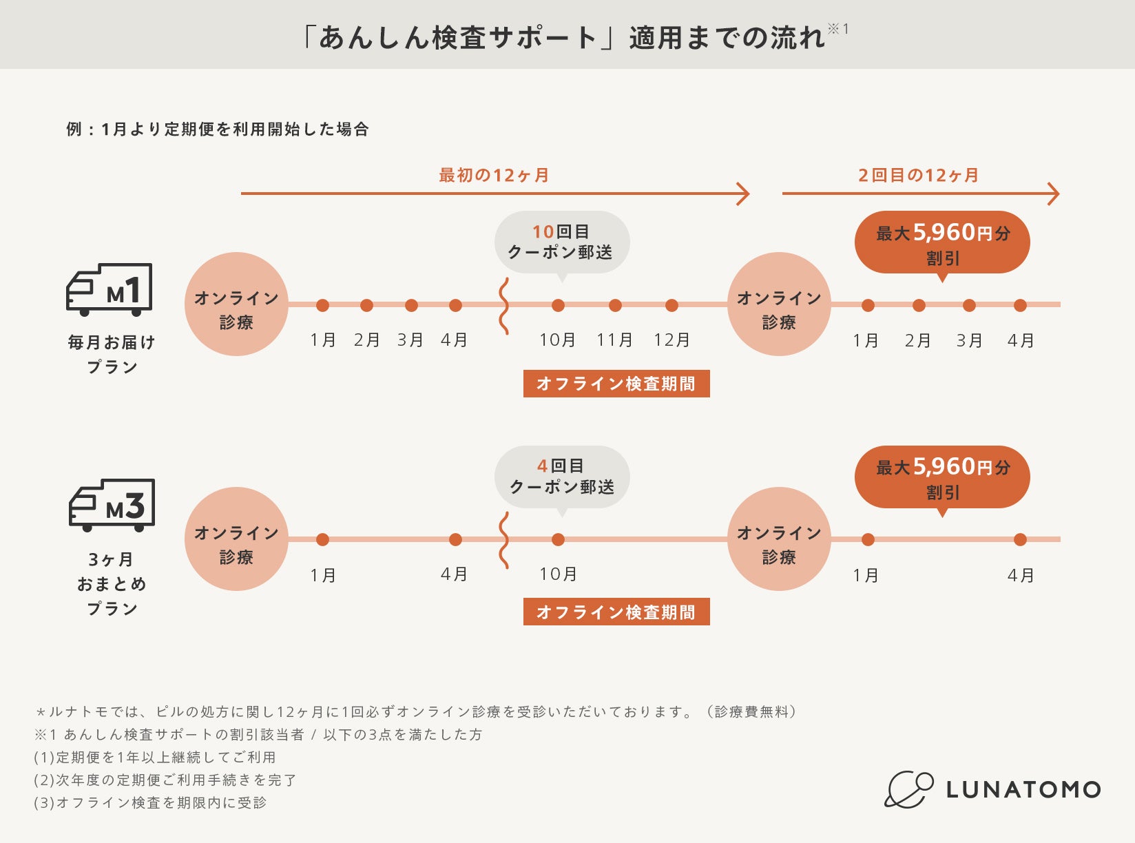定期便の「3カ月おまとめプラン」または「毎月お届けプラン」のいずれかを1年以上継続してご利用かつ次年度の利用手続きをいただいた方(※1)を対象に提供する、提携クリニックで利用できる検査サポートです。クリニックでの自費診療による検査で生じた費用のうち、年間5,960円を上限として、次の12カ月の定期便で処方するピルの代金より割引いたします。