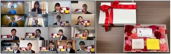 内定証書とともに、新日本製薬の新たな一員になるという想いを込めた「“初めて”の名刺」と、当社商品「パーフェクトワン モイスチャージェル」と「パーフェクトワンフォーカス スムースクレンジングバーム」をお祝いのフラワーボックスに入れて内定者の自宅に送付。内定式内で一斉に開封いたしました。