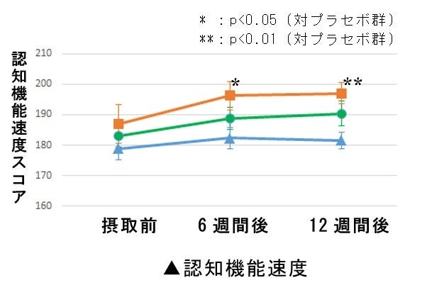 試験食品摂取前、摂取6週間後、摂取12週間後の合計3回の認知機能テストの結果抜粋を以下に示します。