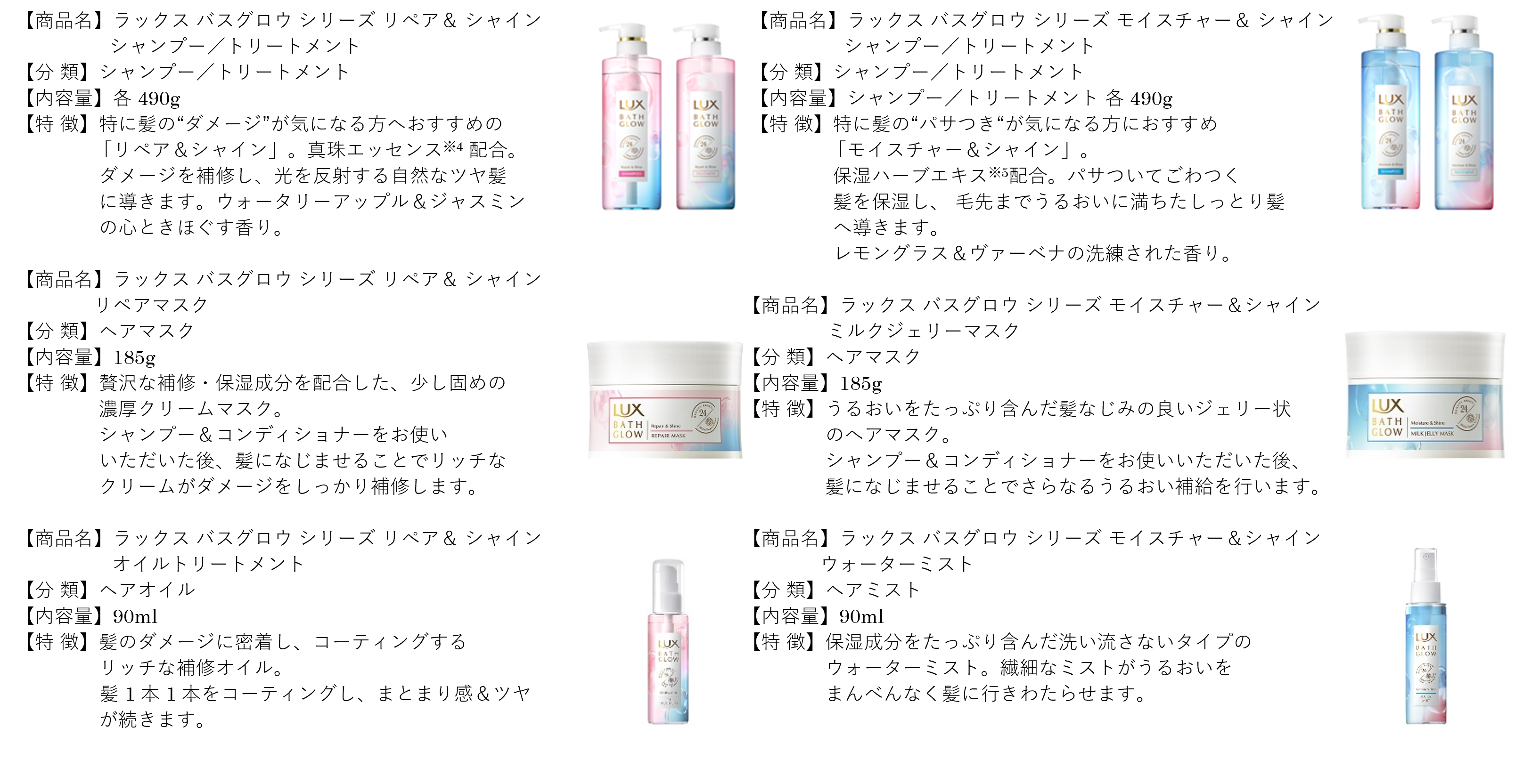 ラックス バスグロウ シリーズは、24種の美容アミノ※2とシロキクラゲエキス※3を配合した、洗いたてのようなうるおいとツヤをキープする“保水美容”をコンセプトとした製品です。ラックス史上初となる24種の美容アミノ配合処方は、髪の芯までうるおいを届けると同時に、髪のダメージを補修し、乾燥を抑えます。また高級化粧品にも使用されている、保水力の高いシロキクラゲエキスを配合した処方で、時間が経ってもうるおい続けるツヤ髪を叶えます。