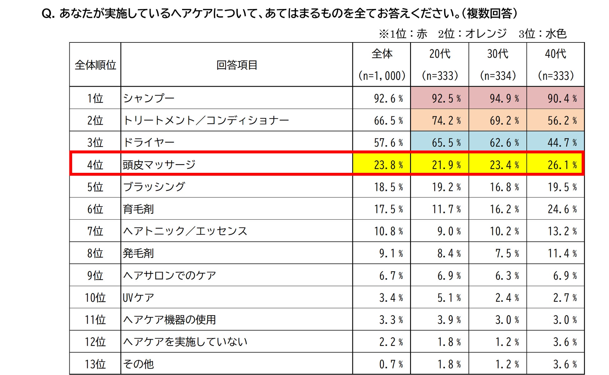 ・全世代の2割以上が「頭皮マッサージ」を実施。自宅で簡単にできるセルフケアとして取り入れる人が一定数いることが明らかに。