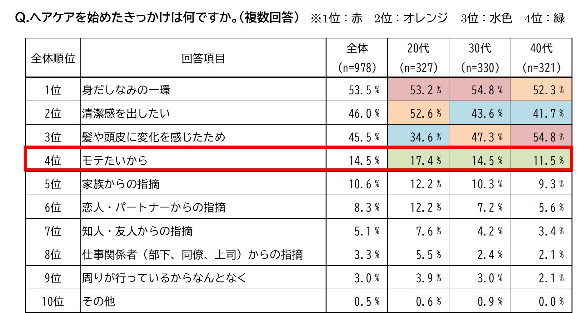 ■ヘアケアを始めたきっかけは、全世代を通して「身だしなみの一環」「清潔感を出したい」「髪や頭皮に変化を感じたため」が上位に。「モテたい」という意向は全世代で4位にランクイン
