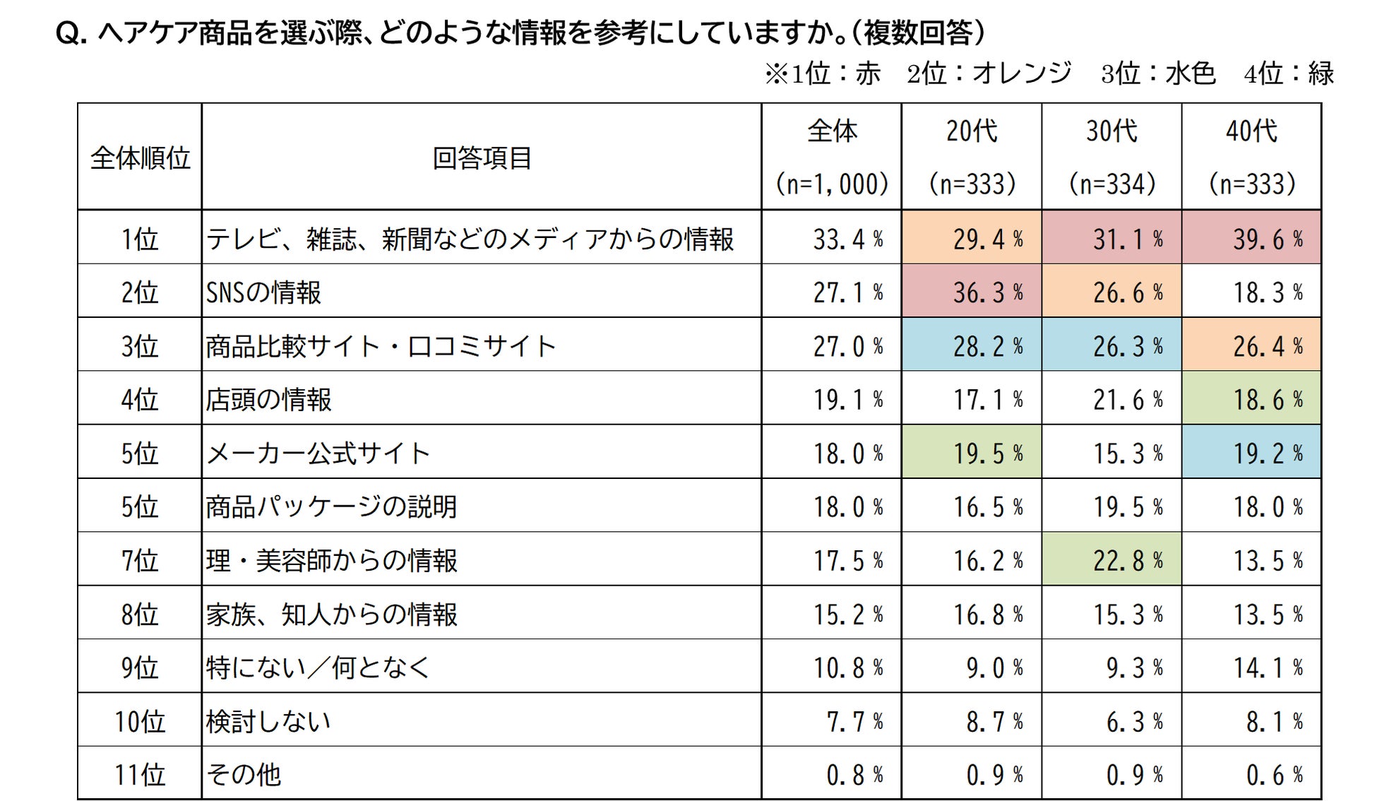 ・ヘアケア商品の情報源、20代は「SNS」が1位、30~40代は「メディアから」と世代間で情報取得方法に差が生じる結果に。