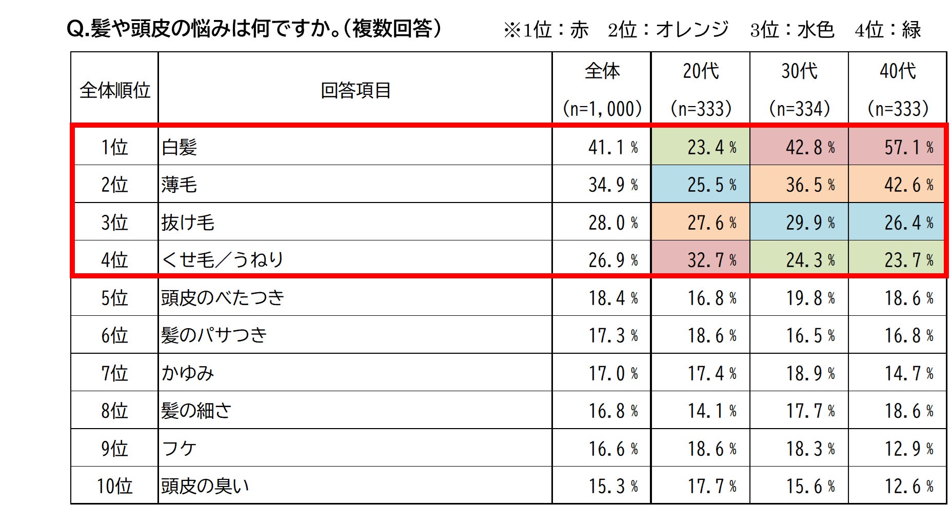 ■髪や頭皮の悩み、20代は「くせ毛/うねり」など髪質を気にする項目が選ばれる一方で、30~40代は「白髪」「薄毛」「抜け毛」など見た目に寄った悩みが上位を占める結果に