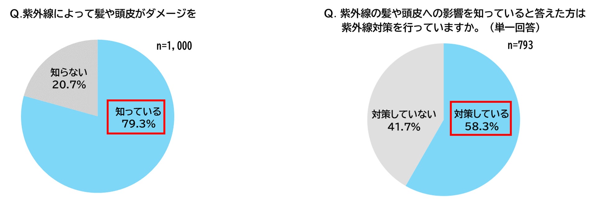 紫外線によって髪や頭皮がダメージを受けることを知っていますか、という質問に対して全世代を通して約8割(79.3%)が知っていると回答。知っていると回答した人のうちの約6割(58.3%)が何かしらの紫外線対策を行っていると回答しました。