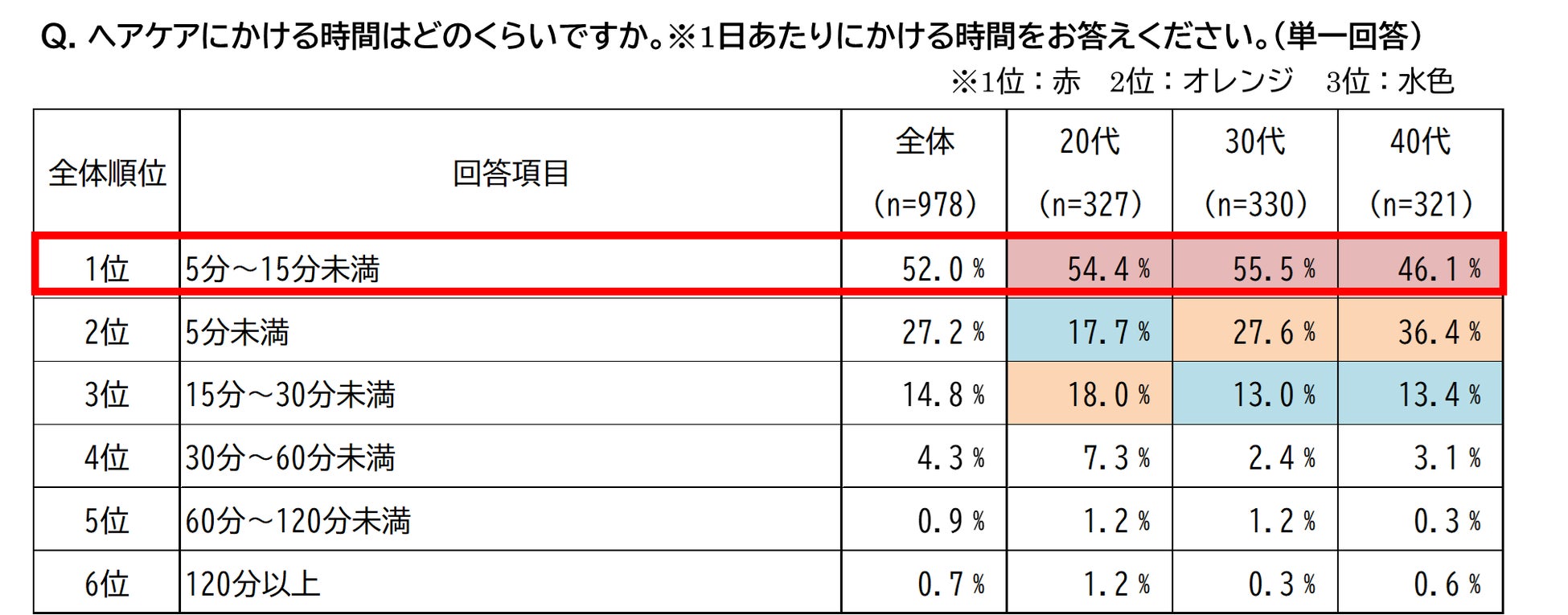 ・ヘアケアにかける時間は全ての世代で「5分~15分」がトップに。20代では「15分~30分」も比較的多い傾向に。
