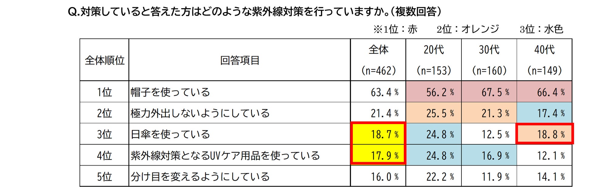 対策の内容については、全世代を通して「帽子を使っている」という回答が1位。また、全世代で「日傘を使っている」「UVケア用品を使っている」と回答した人は約2割(各18.7%/17.9%)。40代でも18.8%の人が日傘を使っているということが分かりました。今回の調査で、ヘアケアに興味がある人は積極的に紫外線対策を行っていることが明らかになりました。