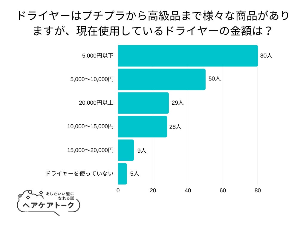 「ドライヤーはプチプラから高級品まで様々な商品がありますが、現在使用しているドライヤーの金額は?」とアンケート調査した結果、1位は『5,000円以下』でした。