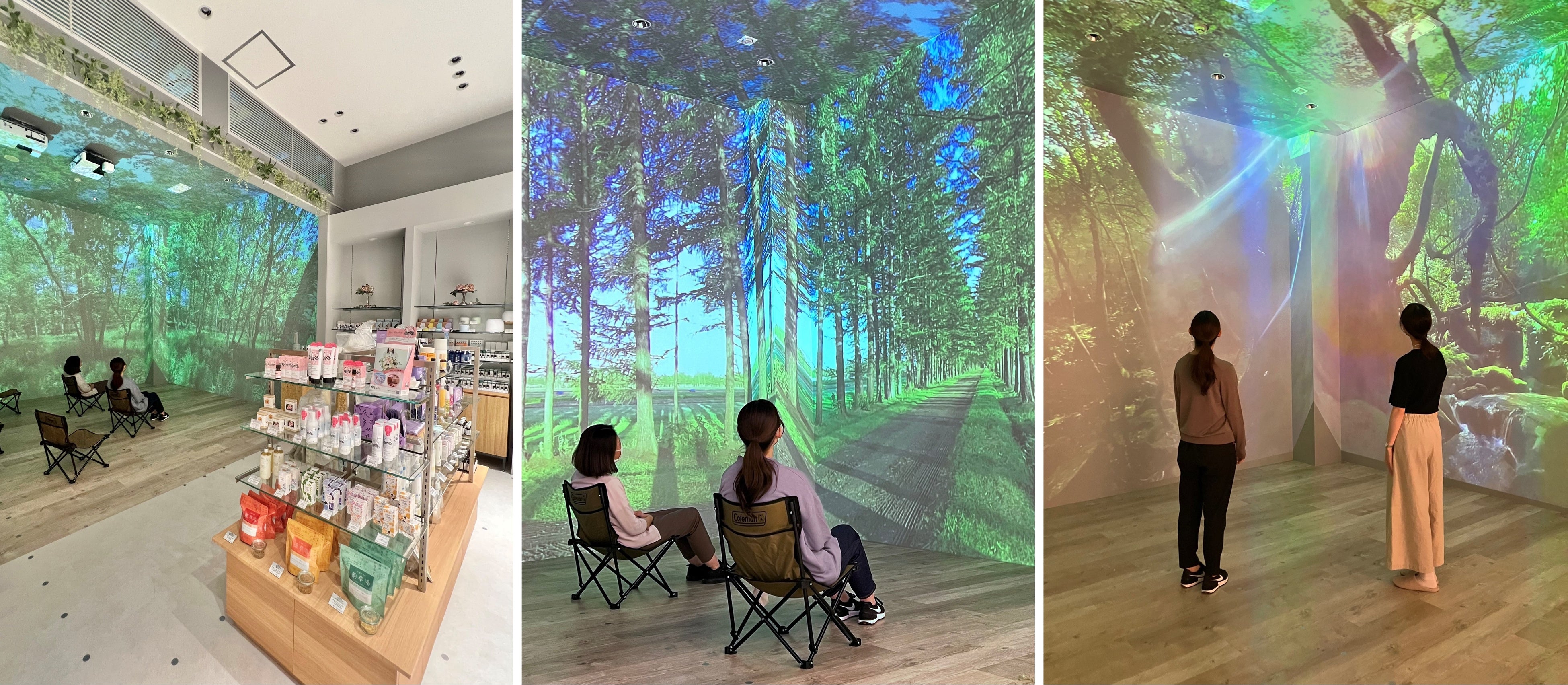 ・体験内容:生活の木が演出する香りとともに、全100シーンを超える日本全国(北海道・沖縄・屋久島 etc)の美しい森林・自然風景をお楽しみいただけます。香りや映像は期間やイベントに準じて変更します。