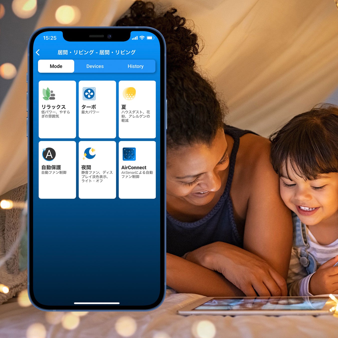 ・スマートフォンから専用アプリを取得し、自宅のWi-Fiにデバイスを接続すれば、室内の湿度など空気の状態をいつでも確認することができます。さらに、デバイスの操作が遠隔から可能。