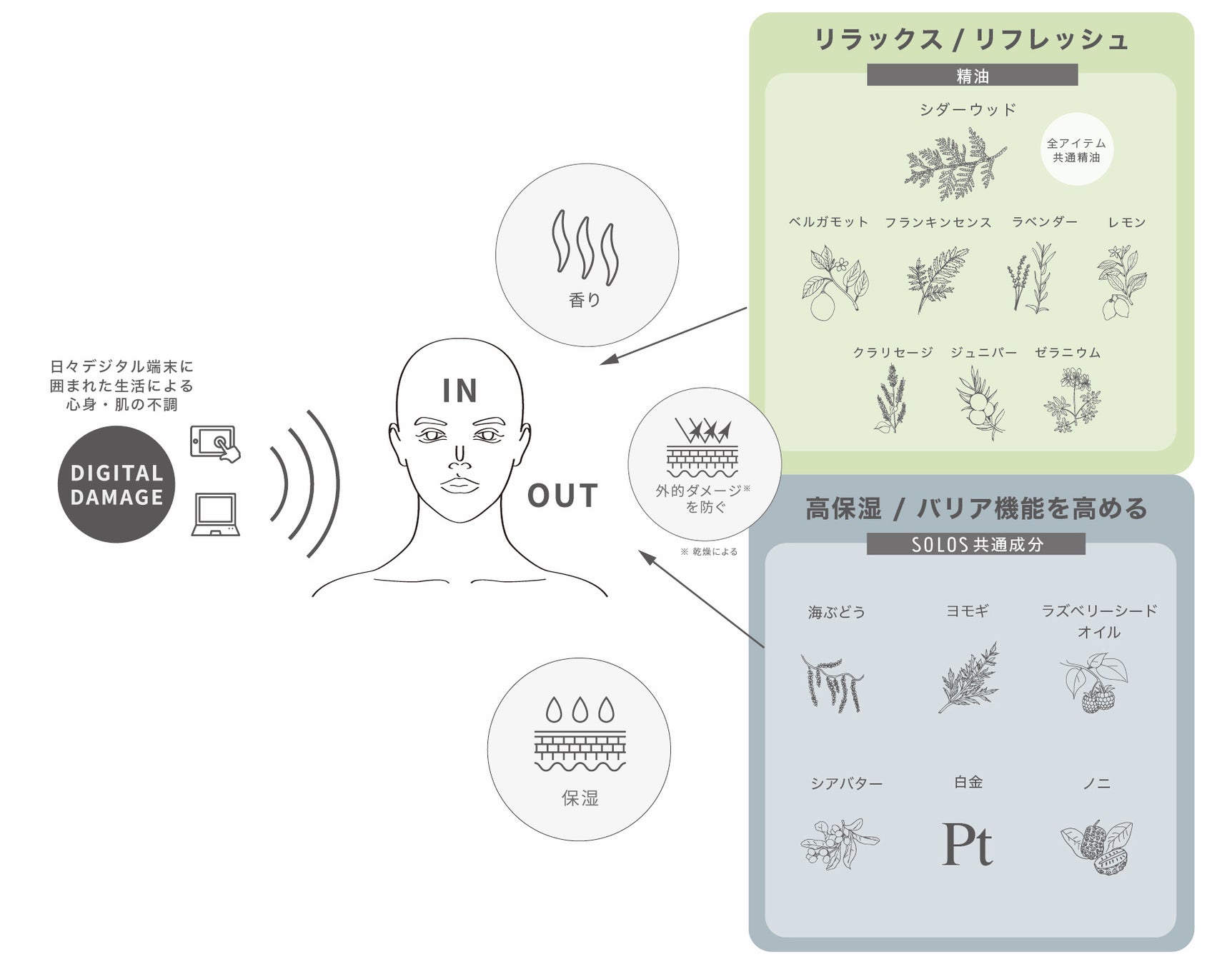 SOLOS のプロダクトは、デジタルと心身・肌の調和がとれた健やかな状態へと導けるよう身体の「内」と「外」から双方にアプローチするよう設計しています。