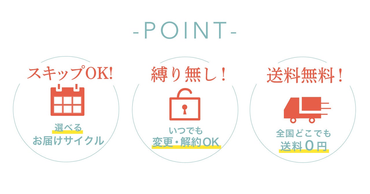 「必ず3回の受け取りが必須」などのルールは一切なく、いつでも解約が可能。定期購入をしたことがない方も安心してご利用いただけます。