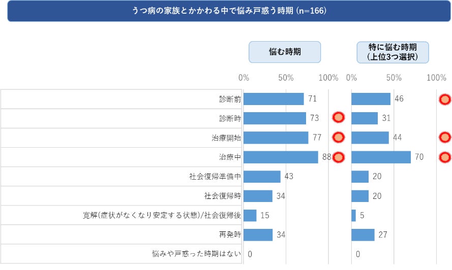 - うつ病患者と関わる中で悩み戸惑う時期としては「治療中」「治療開始」「診断前後」と、治療までの時期に集中している。