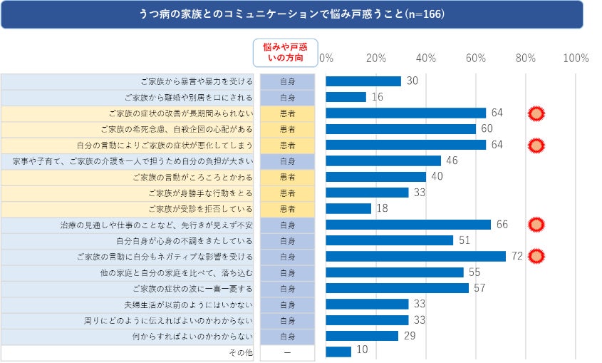 - うつ病の患者とのコミュニケーションは7割以上もの家族が抱えている大きな困りごとであるが、その内容をより詳細に見てみると「患者本人に対する心配」と「サポートする家族自身への影響」の2つに大別される。